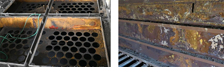 多孔板,隔板,气室内等部位腐蚀严重,局部穿洞