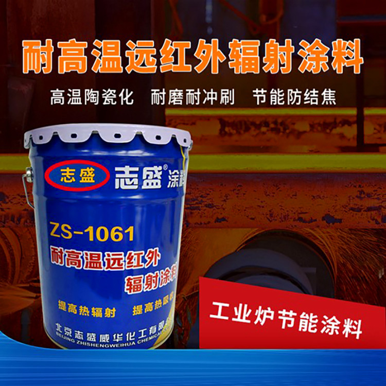ZS-1061耐高温远红外辐射涂料采用特种无机硅酸盐复合体系作为成膜物质,加入过渡族元素氧化物、氧化锆、稀土氧化物Y2O3等填料,耐温1800℃,高温下可稳定保持92%以上的发射率。将其涂覆于炉膛内衬表面,可均化炉膛温度、降低燃烧器热负荷,保护衬里,降低烟气排放温度,提升燃烧效率。